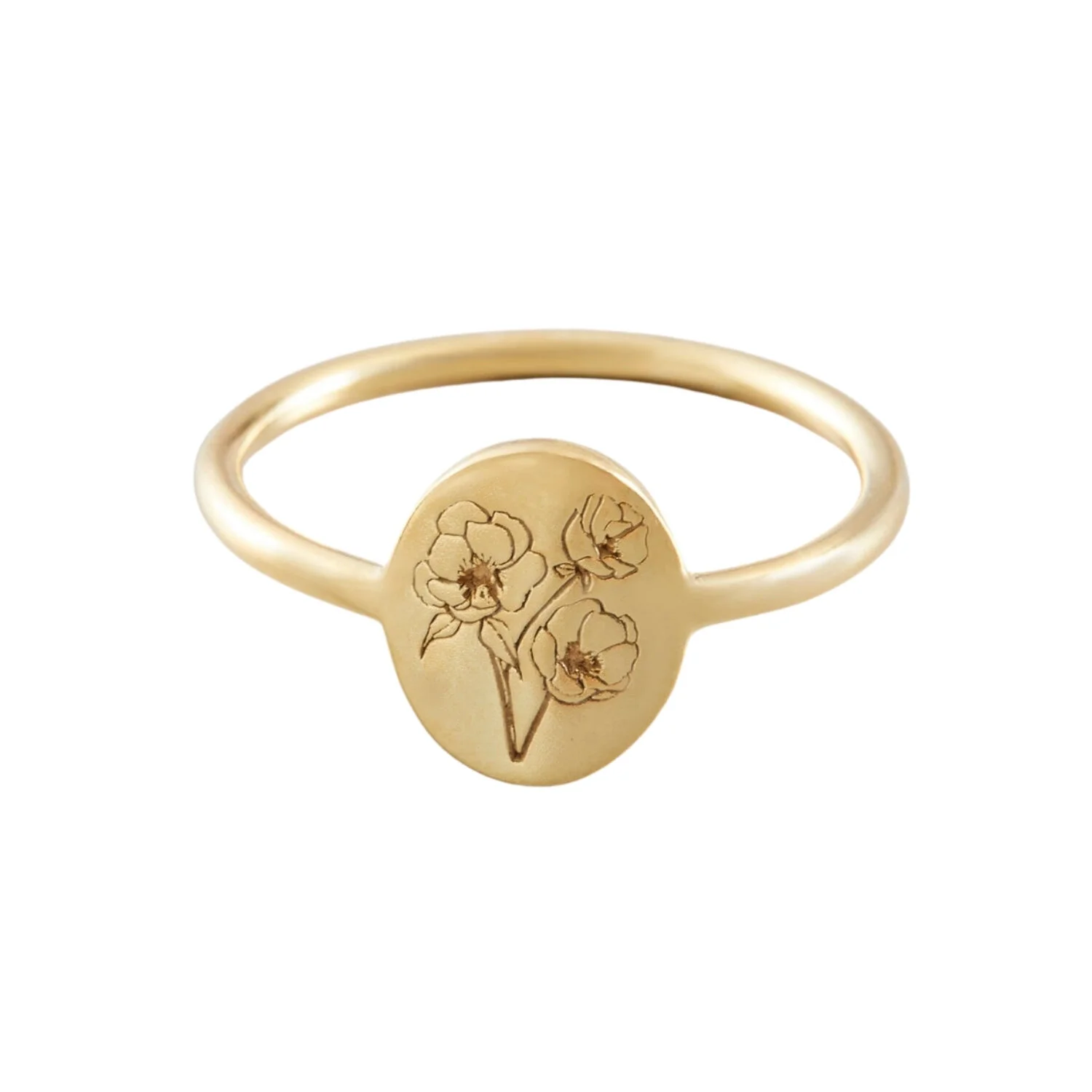 This engraved bauble is a botanical-inspired take on the classic signet ring.