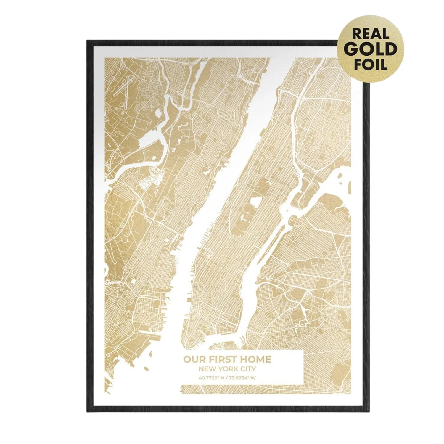 Create a map of where your first met or any other place that has their heart and have it immortalized in this graphic gold print.