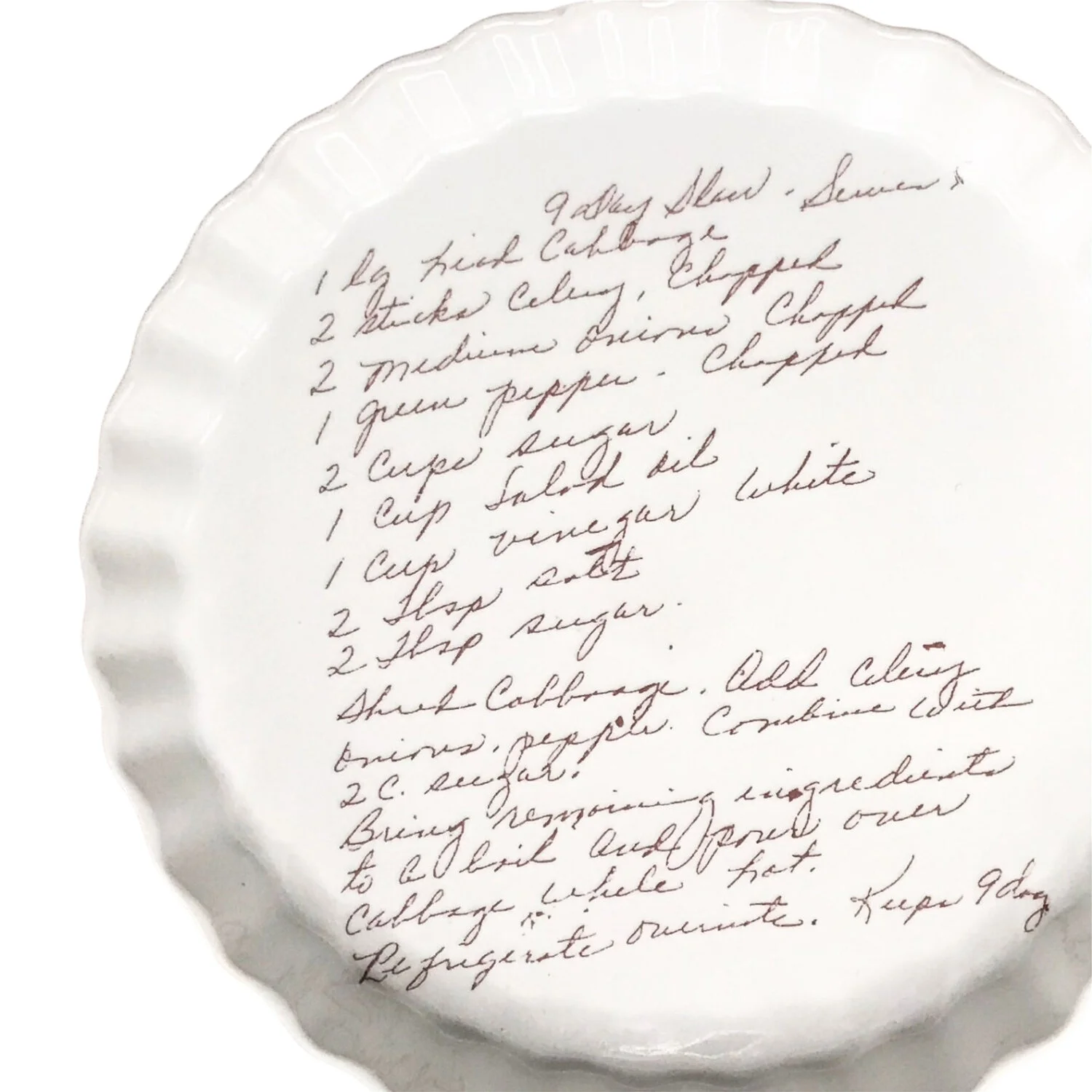 An oven safe pie pan with a handwritten inscription is the perfect way to make sure their mom’s secret recipe is always right where they need it.